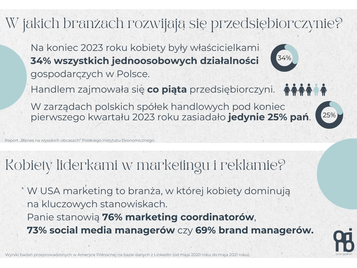 Według raportu „Biznes na wysokich obcasach” Polskiego Instytutu Ekonomicznego na koniec 2023 roku kobiety były właścicielkami 34% wszystkich jednoosobowych działalności gospodarczych w Polsce. W tym przypadku handlem zajmowała się co piąta przedsiębiorczyni, a na kolejnych miejscach uplasowały się firmy związane z opieką zdrowotną i pomocą społeczną, działalnością profesjonalną, naukową i techniczną, a także usługami.