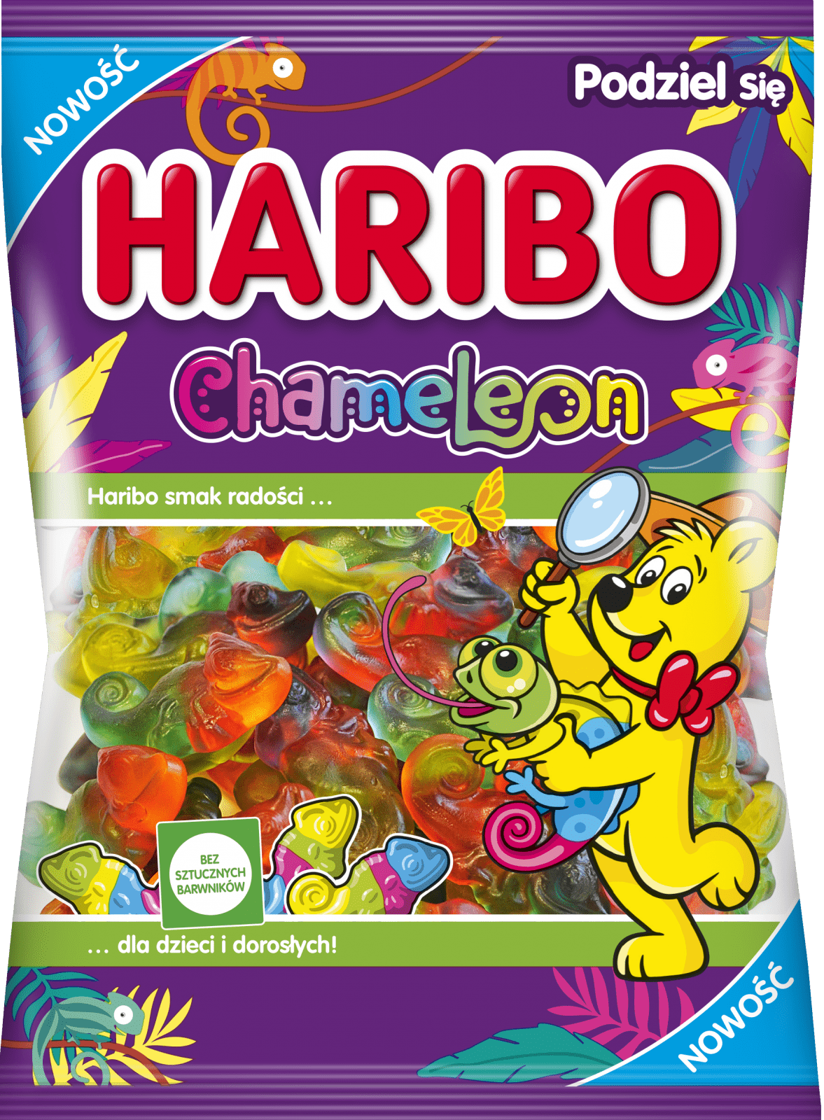 Żelki to produkty wyróżniające się różnorodnością smaków i kształtów. Obecnie w ofercie HARIBO znajdują się zarówno warianty wegańskie i wegetariańskie, jak i tradycyjne żelki owocowe i kwaśne. Regularnie wprowadzane są także nowości, które doskonale odpowiadają na potrzeby wielbicieli żelek. Jedną z najnowszych propozycji marki jest HARIBO Chameleon, dedykowany głównie najmłodszym odbiorcom, którzy uwielbiają żelki w kształcie zwierzątek. HARIBO Chameleon to owocowe żelki kameleony w czterech kolorach i smakach: jabłka, cytryny, wiśni i maliny.