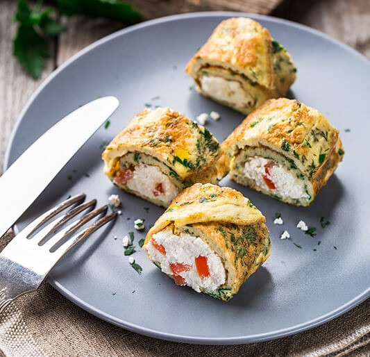 4. Na wystudzonym omlecie rozłóż twarożek, zwiń go w rulon i pokrój na kilkucentymetrowe kawałki.
