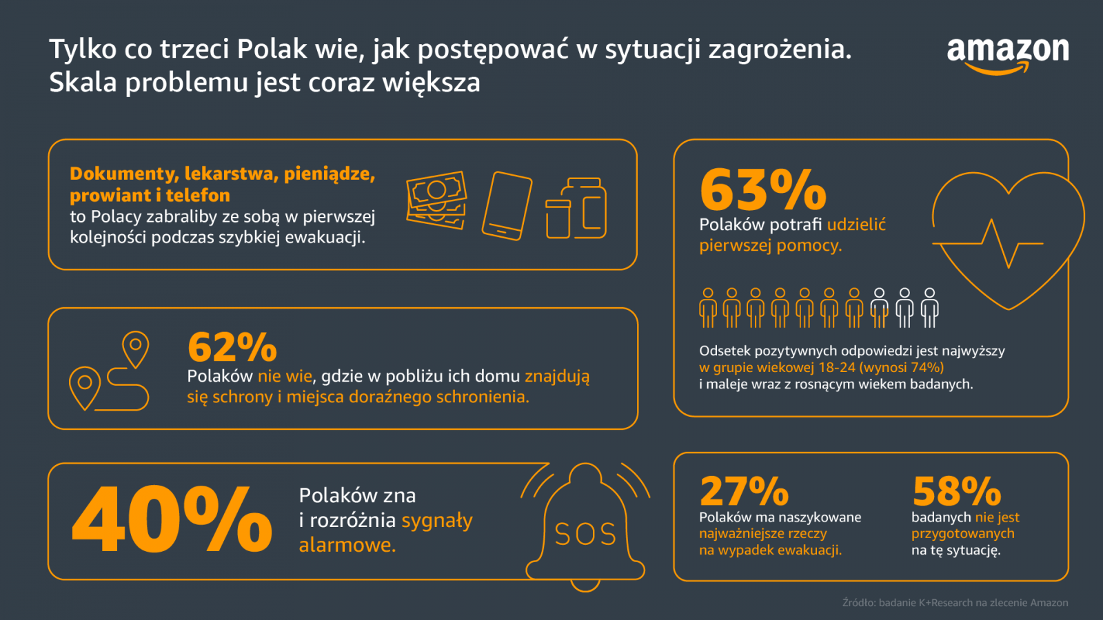 Ostatnie 3 lata pokazały, że powinniśmy być bardziej wrażliwi na punkcie dbałości o własne bezpieczeństwo i zdrowie. Pandemia COVID-19, wojna za wschodnią granicą, a także lokalne katastrofy klimatyczne nie mogą pozostawiać nas obojętnymi na edukację w kwestii tego, jak zachować się w sytuacji zagrożenia. Czy nasze społeczeństwo jest przygotowane na utrzymujący się w związku z tym stan podwyższonego ryzyka i czy posiada odpowiednią wiedzę, aby się z nim zmierzyć? Z badania przeprowadzonego przez K+Research na zlecenie Amazon wynika, że jedynie 37 proc. Polaków wie, co dokładnie należy zrobić, aby uchronić siebie i bliskich przed niebezpieczeństwem w sytuacji zagrożenia, takim jak klęska żywiołowa lub wybuch konfliktu militarnego.